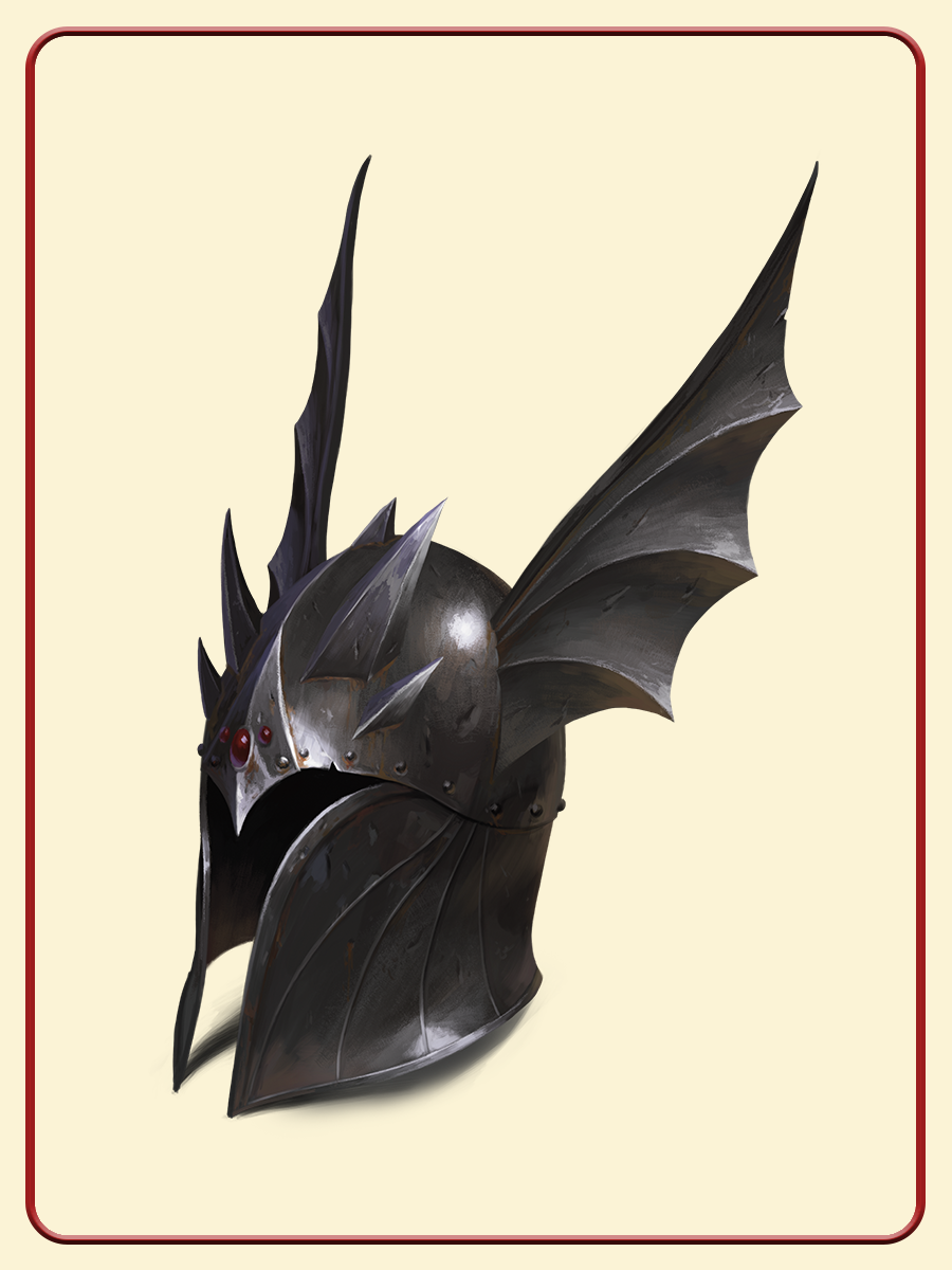 While you’re wearing this fearsome steel helm, your eyes glow red and the rest of your face is hidden in shadow.