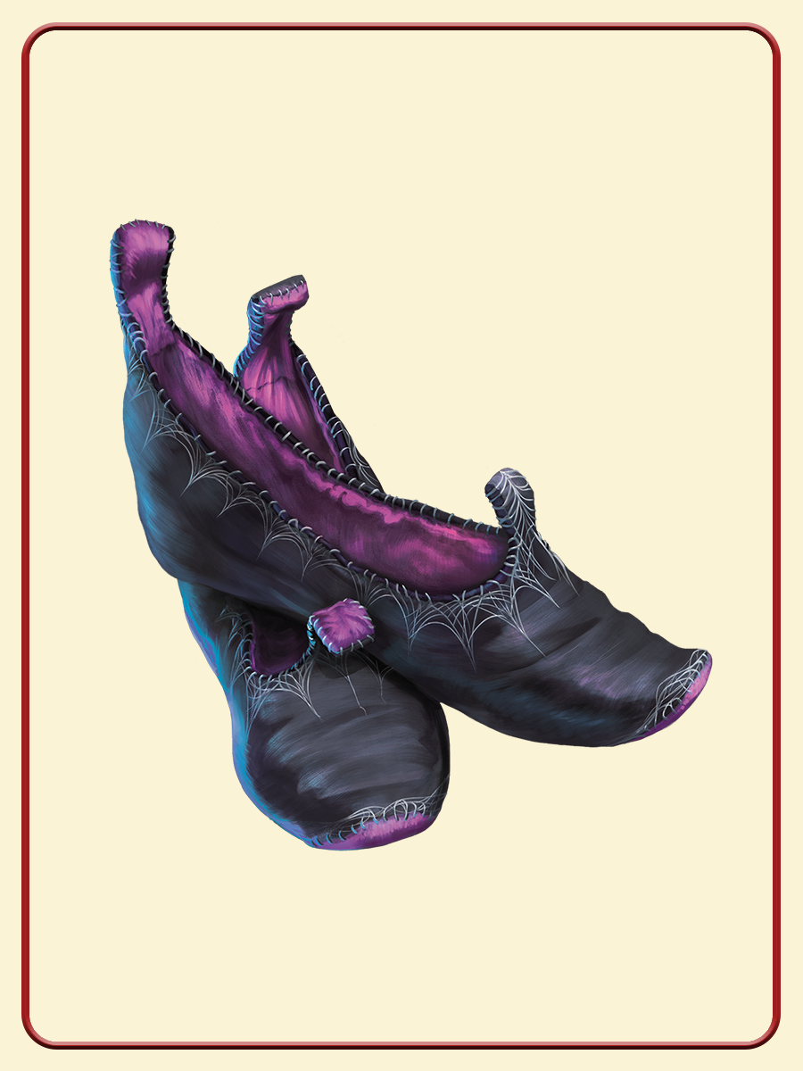 While you wear these light shoes, you can move up, down, and across vertical surfaces and along ceilings, while leaving your hands free. You have a Climb Speed equal to your Speed. However, the slippers don’t allow you to move this way on a slippery surface, such as one covered by ice or oil. |