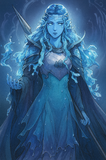 Siren Rishath al-KaalithSize: 175 (medium) Costomizing your Origin: Race: Triton (Half Triton/Genie) Choose a Class: Cleric Choose a Background: Oceans Voice (Far Traveler - Emissary) Class Equipment: Cleric BiographySiren "Sea" Rishath al-Kaalith – Wächterin der Gezeiten Tief in der See der Fallenden Sterne, wo die Grenzen zwischen sterblicher See und der elementaren Ebene des Wassers verschwimmen, wurde Siren Rishath al-Kaalith geboren – eine Tochter des Meeres und der Stürme. Ihre Mutter, Nahlyn Rishath, eine Halb-Seeelf, Halb-Triton-Priesterin des Deep Sashelas, hatte sich dem Schutz der Ozeane verschrieben. Ihr Vater, Ishalaan al-Kaalith, war ein mächtiger Marid Djinn, ein Botschafter zwischen der Elementarebene des Wassers und den Völkern der sterblichen Meere. Was als flüchtige, aber leidenschaftliche Verbindung begann, hinterließ eine tiefere Spur – Siren, eine Water Genasi mit dem Blut dreier Welten in ihren Adern. Schon als Kind war sie ein Wesen der Extreme. Still und unergründlich wie die Tiefsee, doch leidenschaftlich und unberechenbar wie ein aufziehender Sturm. Sie konnte sich mit der Ruhe einer verborgenen Lagune zurückziehen oder mit der unbändigen Kraft der Gezeiten zuschlagen. Von ihrer Mutter lernte sie den Glauben an Deep Sashelas, die Heiligen Lieder des Meeres, die Kunst des Schutzes und der Heilung. Von ihrem Vater übernahm sie das Wissen um die ungezähmte Natur des Wassers, die Macht der Strömungen und die Geheimnisse der Elementaren Magie. Doch Siren fühlte sich nie an einen einzigen Pfad gebunden. Während sie die Traditionen einer Priesterin ehrte, zog es sie zugleich zur rohen, wilden Magie der Natur hin. Ihr Herz schlug für die Ozeane, aber sie wollte mehr sehen als die Tiefen, in denen sie geboren wurde. Mit dem Segen von Mutter und Vater trat sie eine Pilgerreise an – nicht nur, um sich in den Lehren ihres Gottes weiterzubilden, sondern auch, um das unbekannte Land jenseits der Wellen zu erkunden. Ein Wächter des Meeres auf unbekanntem Terrain Mit ihrer fließenden, wassergeborenen Gestalt und einem Trident-artigen Speer aus schwarzem und silbernem Metall betrat sie die Küsten fremder Länder. An ihrer Stirn glänzte eine silberne Tiara, ein Symbol ihres Erbes, und in ihren Haaren – die aus lebendigem Wasser bestanden – schwamm Silk, ein kleiner Wasserdrache, der als ihr treuer Begleiter stets an ihrer Seite blieb. Auf ihrer Reise begegnete sie neuen Kulturen, neuen Gefahren – und neuen Bündnissen. Sie verteidigte Fischer vor Piraten, heilte kranke Meeresbewohner und zerschmetterte jene, die die Ozeane entweihten. Doch die Welt an Land war fremd. Würde ein Kind des Meeres in der Welt der Landbewohner einen Platz finden können? Mit jedem Schritt auf trockenem Boden stellte sie sich dieser Frage – und jedem Sturm, der ihren Weg kreuzte. Das Erscheinungsbild von Siren "Sea" Rishath al-Kaalith Siren ist eine Gestalt, die die wilde Schönheit des Ozeans und die unbändige Kraft des Wassers in sich vereint. Ihre bloße Präsenz erinnert an das endlose Meer – manchmal ruhig, sanft wie eine verborgene Lagune, doch ebenso fähig, zur tobenden Sturmflut zu werden. Ihre Haut ist von einem schimmernden, aquatischen Blau, das sich je nach ihrer Stimmung verändert. In Momenten der Ruhe leuchtet sie in einem hellen, fast leuchtenden Blau, wie das Licht, das durch klares Wasser fällt. Doch wenn Emotionen in ihr hochkochen, dunkelt sie nach – ein tiefes, nachtblaues Meer, das mit verborgenen Strömungen flackert. Sirens Augen sind von einem kristallklaren Eisblau, als wären sie aus reinem, gefrorenem Wasser geformt. Ihr Blick trägt die Weisheit der Ozeane, zugleich kühl und voller Verheißung, als würde er in die unerforschten Abgründe der Meere blicken. Wenn sie Magie wirkt, glühen sie leicht, als ob die Gezeiten selbst durch sie sprechen. Ihr Haar besteht nicht aus gewöhnlichen Strähnen – es ist lebendiges, fließendes Wasser. Die langen Wellen reichen ihr bis zur Hüfte und bewegen sich wie sanfte Strömungen, egal ob Wind oder Wellen um sie tanzen. Mal funkelt es silbern wie das Licht auf einer Wasseroberfläche, mal schimmert es in tiefem Blau, als würde der Ozean selbst durch sie fließen. Sanft schimmernde, fast perlmuttartige Schuppen ziehen sich entlang ihrer Wangenknochen, über ihre Schultern und entlang der Arme und des Rückens. Sie sind filigran, kaum sichtbar im ruhigen Licht, doch wenn sie sich bewegt oder das Mondlicht auf sie trifft, leuchten sie mit einem sanften Schimmer – ein Echo ihrer Seeelf- und Triton-Wurzeln. Ihre Ohren sind länglich und finnenartig, ähnlich denen eines Tritons, doch geschwungener und mit feinen, durchscheinenden Membranen versehen, die sanft vibrieren, wenn das Wasser mit ihr spricht. Sie sind ein weiteres Zeichen ihres aquatischen Erbes und verleihen ihr eine noch exotischere, nicht-menschliche Schönheit. Über ihrem geschmeidigen Körper trägt sie eine helle blaue Robe, deren Stoff so leicht ist, dass er wirkt, als würde er sich wie Wasser um sie legen. Die weiten Ärmel sind in einem dunkleren Blau gehalten, als würden sie die dunkleren Tiefen des Ozeans widerspiegeln. Darüber trägt sie eine Halbplatte, die sowohl Schutz als auch ihre Zugehörigkeit zu den Meeresvölkern zeigt. Das Metall ist in Schwarz und Silber gehalten, ein Kontrast, der an das Licht erinnert, das sich auf der Wasseroberfläche spiegelt. In die Brustplatte ist das Emblem ihres Hauses eingelassen, ein kunstvoll gewobenes Symbol aus Wellen, das ihre Herkunft als Tochter eines Marid Djinn und einer Priesterin des Meeres ehrt. In ihren Händen ruht ein speerartiger Dreizack, geschmiedet aus schwarzem und silbernem Metall. Er scheint eine eigene, sanfte Energie auszustrahlen, fast als würde er mit den Gezeiten atmen. Der Dreizack ist nicht nur eine Waffe – er ist ein Symbol ihrer Bestimmung als Beschützerin des Meeres und ihres tiefen Glaubens an Deep Sashelas. Auf ihrer Stirn ruht eine silberne 