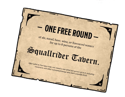 Teilnehmer: Info: Loot: 35gp Trinket: Necklace woven of dried seaweed (geschenkt von Shale) Squallraider´s Jug of Plenty (Alchemy Jug) This ceramic jug appears to be able to hold a gallon of liquid and weighs 12 pounds whether full or empty. The jug sloshes when it is shaken, even if the jug is empty. This item is found in the Dungeon Masters Guide. Blissful. While in possession of the item, the bearer feels fortunate and optimistic about what the future holds. This souvenir jug is only available aboard Agrettanui and is typically sold to travelers at a hefty price. The cylindrical vessel is the size of a canteen and comes with a shoulder strap that lets one carry it with ease. A stylized image of the dragon turtle is emblazoned on its side, showing off to the world that the bearer has experienced the luxury voyage. |