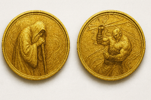 This gold coin has a creature embossed on each side. The two depicted creatures must be famous rivals or enemies of each other. For example, a Rival Coin might show Iggwilv on one side and Mordenkainen on the other, or Venger on one side and Tiamat on the other. One of these figures is on the “heads” side of the coin, the other on the “tails” side.